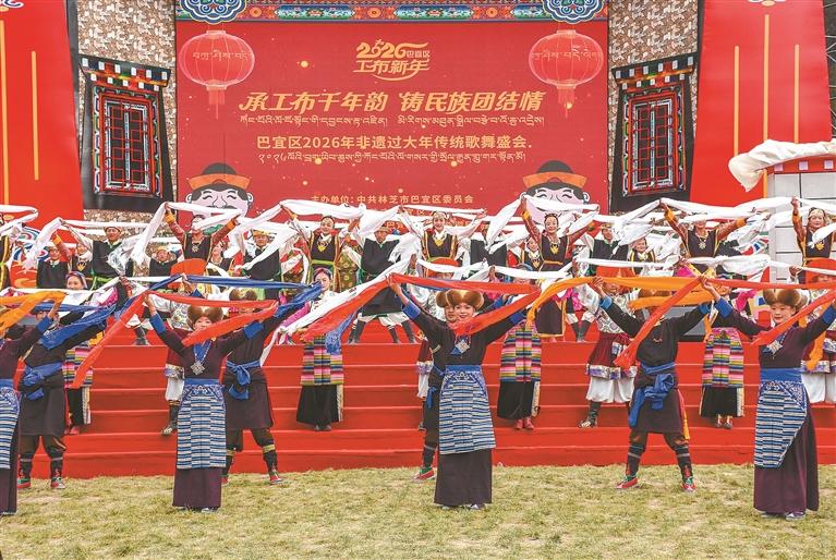 11月21日(工布新年大年初一),在林芝市巴宜區(qū)依舍莊園,“承工布千年韻 鑄民族團結(jié)情”——巴宜區(qū)2026年“非遺過大年”傳統(tǒng)歌舞盛會精彩上演。整場演出圍繞工布年味、非遺傳承、民族團結(jié)三大主題,分設(shè)“歲月如歌·福滿工布”“匠心歡歌·情系家園”“團結(jié)歡歌·共譜華章”三大篇章,20余個節(jié)目涵蓋男女聲獨唱、民俗舞蹈、器樂演奏等多種表演形式,將高原獨特民俗風情與深厚文化底蘊相融合,為市民游客帶來了一場具有民族特色的視聽盛宴。