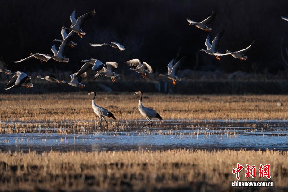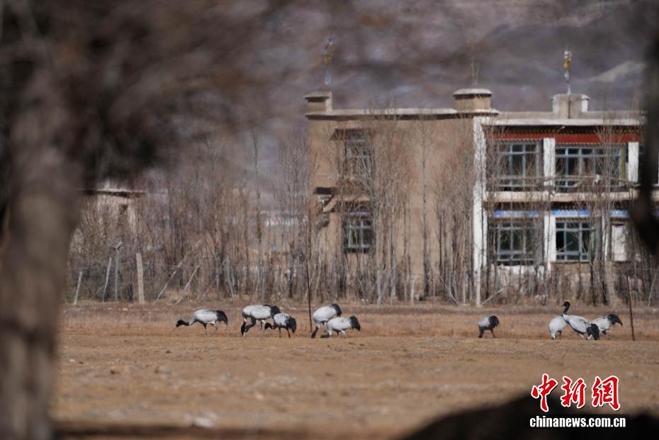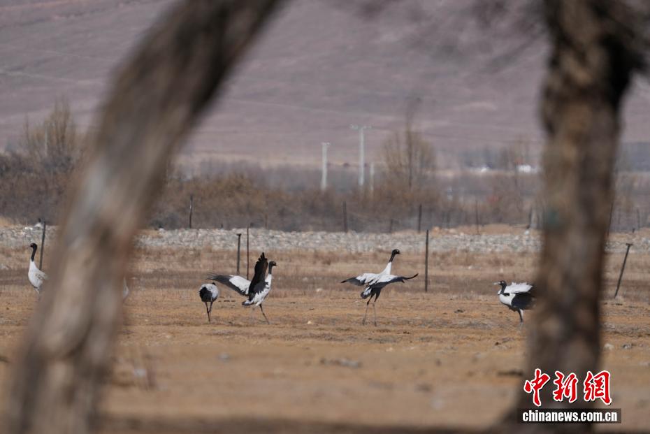 11月26日,位于西藏自治區(qū)拉薩市林周縣黑頸鶴自然保護區(qū)內,大批越冬黑頸鶴現身卡孜水庫及田間地頭,悠閑覓食、嬉戲。這些遠道而來的黑頸鶴,將在此棲息至次年三四月份。黑頸鶴為中國國家一級保護動物,也是唯一在高原生活、繁殖的鶴類。近年來,隨著當地生態(tài)保護力度持續(xù)加大,前往林周縣越冬的黑頸鶴等候鳥數量逐年增多。圖為黑頸鶴在林周縣境內的農田里覓食、嬉戲。貢確 攝