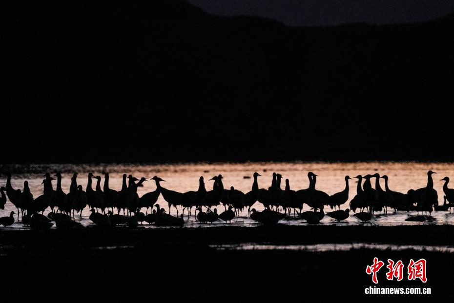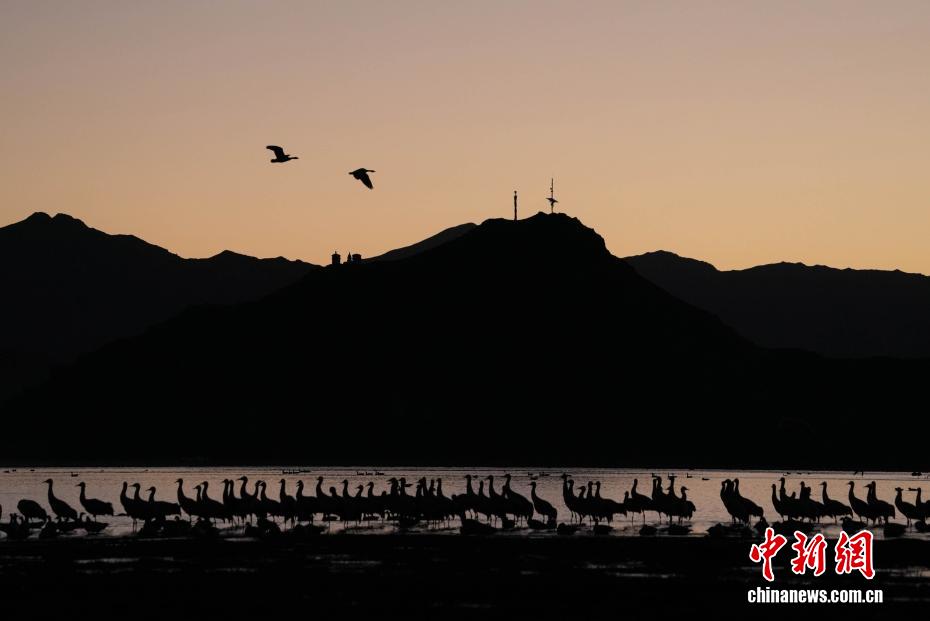 11月26日,位于西藏自治區(qū)拉薩市林周縣黑頸鶴自然保護區(qū)內,大批越冬黑頸鶴現身卡孜水庫及田間地頭,悠閑覓食、嬉戲。這些遠道而來的黑頸鶴,將在此棲息至次年三四月份。黑頸鶴為中國國家一級保護動物,也是唯一在高原生活、繁殖的鶴類。近年來,隨著當地生態(tài)保護力度持續(xù)加大,前往林周縣越冬的黑頸鶴等候鳥數量逐年增多。圖為在林周縣卡孜水庫拍攝的黑頸鶴。貢確 攝