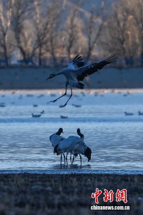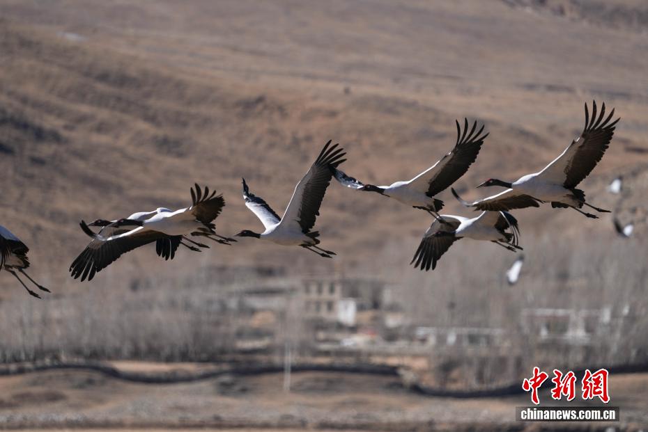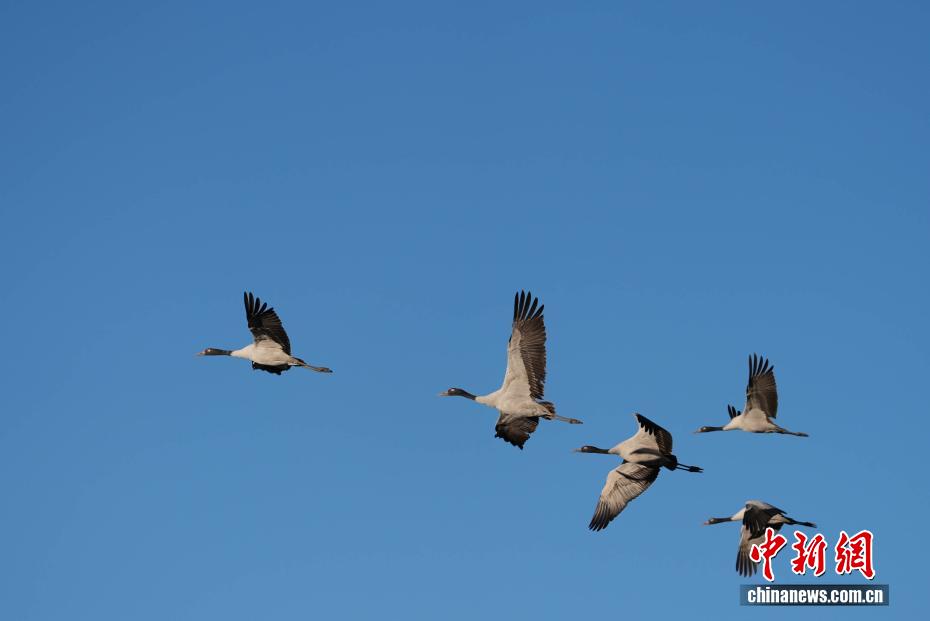 11月26日,位于西藏自治區(qū)拉薩市林周縣黑頸鶴自然保護區(qū)內,大批越冬黑頸鶴現身卡孜水庫及田間地頭,悠閑覓食、嬉戲。這些遠道而來的黑頸鶴,將在此棲息至次年三四月份。黑頸鶴為中國國家一級保護動物,也是唯一在高原生活、繁殖的鶴類。近年來,隨著當地生態(tài)保護力度持續(xù)加大,前往林周縣越冬的黑頸鶴等候鳥數量逐年增多。圖為黑頸鶴在林周縣黑頸鶴保護區(qū)內飛翔。貢確 攝