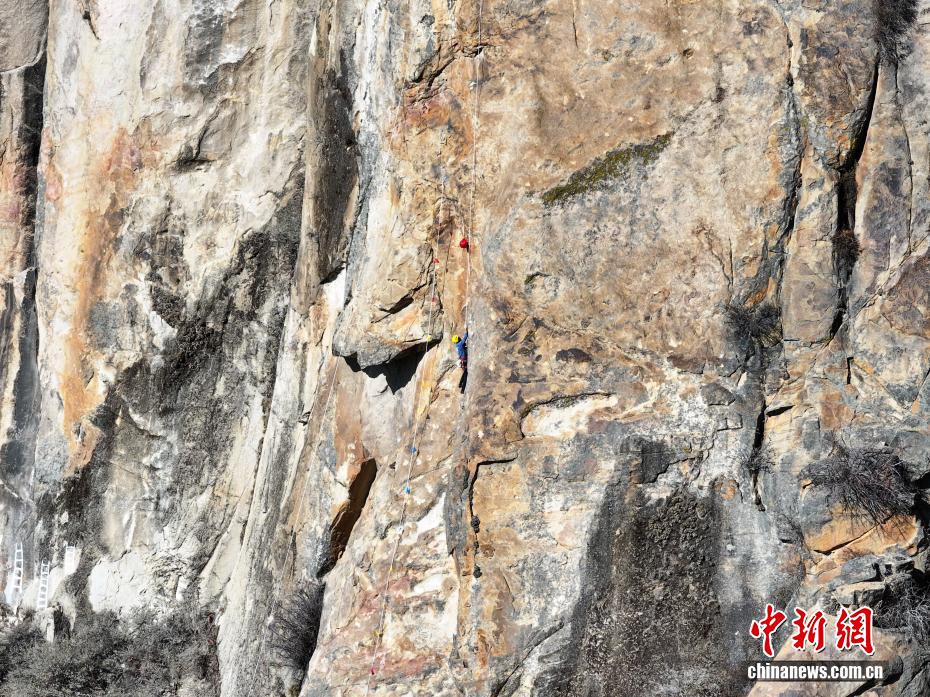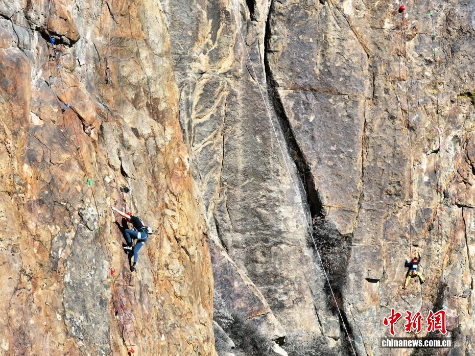 11月29日,2025西藏自治區(qū)攀巖自然巖壁公開賽在拉薩市奪底溝吉倉自然巖壁場地開賽。來自中國全國的70名運(yùn)動員、高校學(xué)生及社會攀巖愛好者參賽。(無人機(jī)照片)中新社記者 貢嘎來松 攝