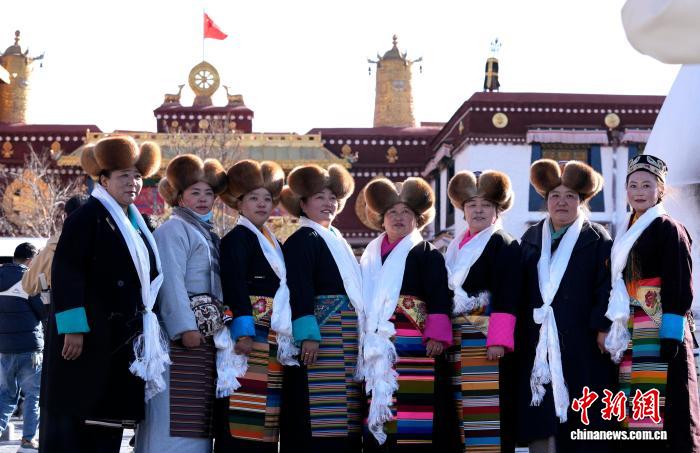 圖為拉薩婦女盛裝在大昭寺廣場合影。中新社記者 李林 攝