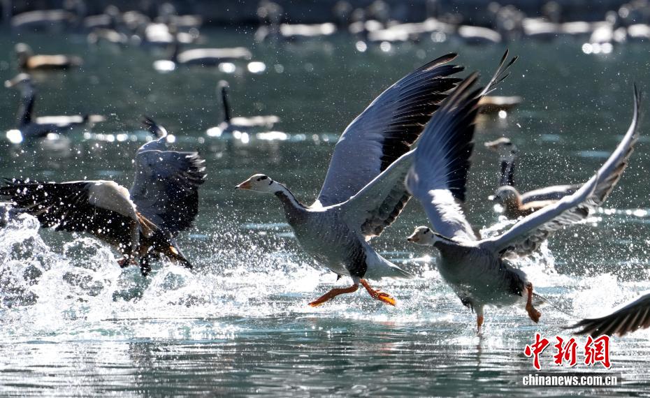 12月17日,西藏拉薩市區(qū)宗角祿康公園,大批斑頭雁“集結(jié)”越冬。成群結(jié)隊的斑頭雁等越冬候鳥吸引市民游客駐足觀賞、拍照留念。圖為宗角祿康公園越冬的斑頭雁。