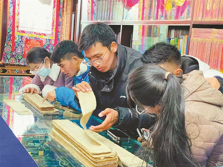 學(xué)生在藏醫(yī)展館翻閱藏醫(yī)藥技藝配方。
