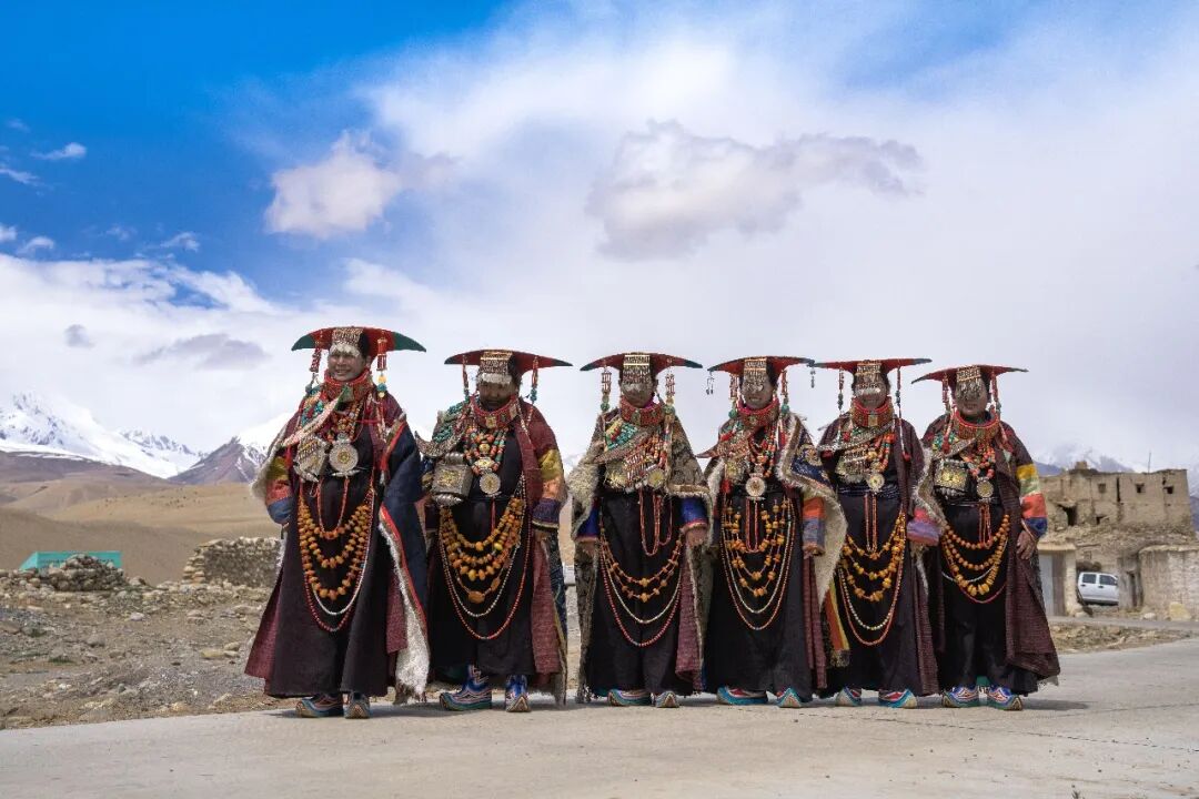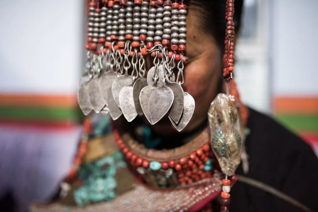 這些服飾上的花紋、顏色和裝飾品都有特定寓意,記錄著普蘭悠久的歷史和與周邊地區(qū)的文化交流,被譽(yù)為“穿在身上的史詩(shī)”。這套服飾雍容華貴,單是穿戴就要一個(gè)多小時(shí)。地處貿(mào)易要道的普蘭人,將遙遠(yuǎn)的珊瑚、黃金、蜜蠟、白銀、綠松石、珍珠全都裝飾在“宣”服上,展示著對(duì)這襲錦袍的無比珍視。