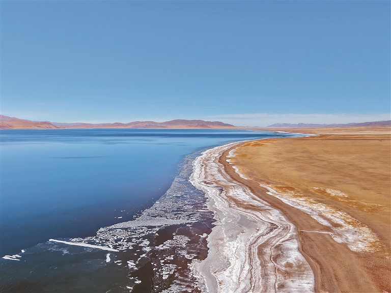 回到車上,身體漸漸暖和起來。車窗外,色林錯在夕照下變幻著色彩:近岸的浪花凍結(jié)成層層疊疊的冰凌;遠處的湖面仍泛著深藍的波光,與天際線融為一體。