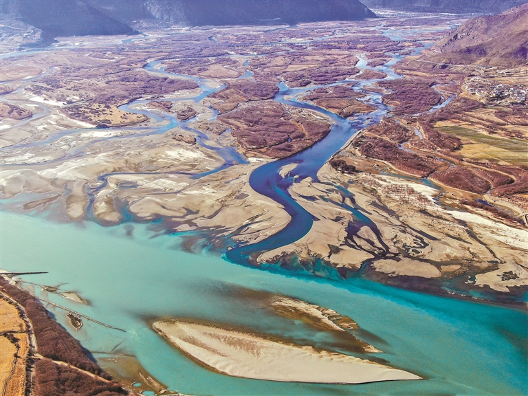 冬日的雅魯藏布江,渚清沙白、色彩斑斕,江水宛如打翻了調(diào)色盤的畫布,是高原生態(tài)之美的靈動展現(xiàn)。在雅尼濕地,尼洋河的碧流撞進雅魯藏布江的清波,澄澈的藍綠主色調(diào)在河道中暈染開來,深淺交織的水色勾勒出蜿蜒的“水脈”,淺灘沙洲如白玉雕琢的游魚,靜靜“浮”在碧波間,將江面涂抹成一幅流動的水彩畫。