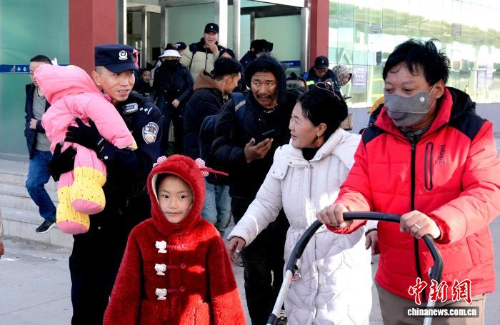圖為那曲站派出所民警幫助進站老百姓。李林攝
