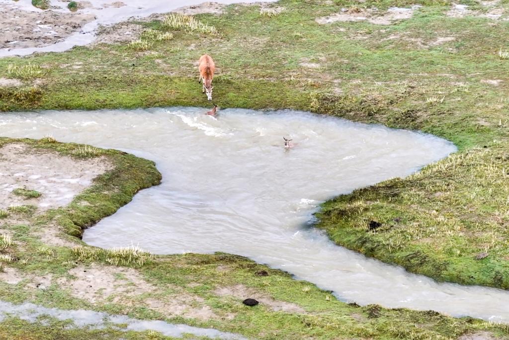 森隆藏布河最窄處僅有一米寬,但水流湍急,剛出生不久的藏羚羊幼崽過河前,需母羊反復(fù)測試路線,引導(dǎo)幼崽在合適的位置跳躍或趟水渡河。