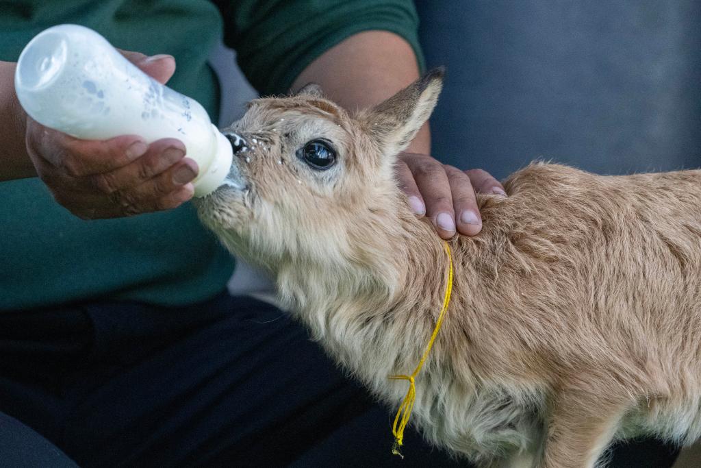 措羅木管理站站長阿旺洛卓在給藏羚羊幼崽喂奶(2025年7月16日攝)。
