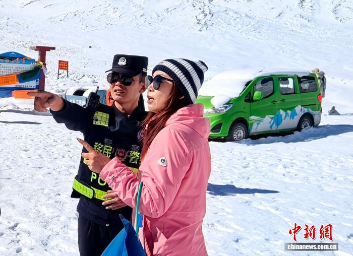 圖為珠峰邊境派出所民警為游客咨詢提供幫助指引。索朗怕加 攝