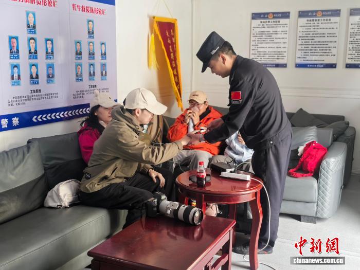 圖為珠峰邊境派出所民警為大本營景區(qū)游客提供氧氣和熱水等便民服務(wù)。馬華亮 攝