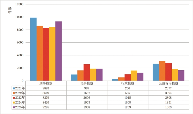 2021年—2025年全區(qū)檢察機關(guān)“四大檢察”業(yè)務(wù)趨勢變化圖