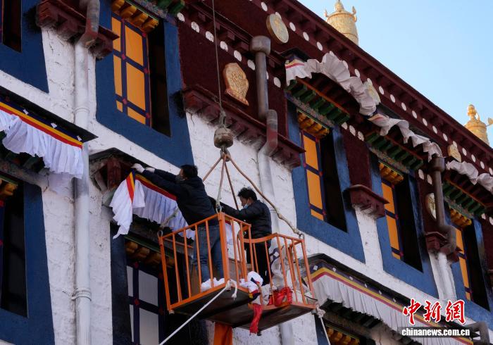 2月5日,西藏大昭寺更換“香布”,迎藏歷新年。“香布”是藏式建筑的裝飾,通常用五彩棉布縫制,主體為白色,搭配紅藍黃等色的邊沿,對窗沿等的顏料及木構件起到保護作用。圖為工人們正乘坐吊車更換大昭寺“香布”。中新社記者 李林 攝