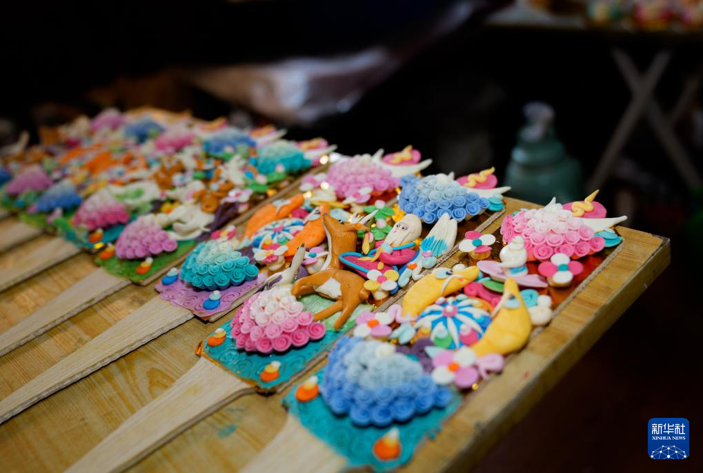 酥油花以色彩鮮亮的酥油為原材料,經(jīng)手工藝人在冷水里反復(fù)揉捏定型降溫后,用木刀精雕成日月星辰、花葉藤蔓及動(dòng)物造型,再拼接粘貼在盾形木板上,制作成栩栩如生的酥油花作品。