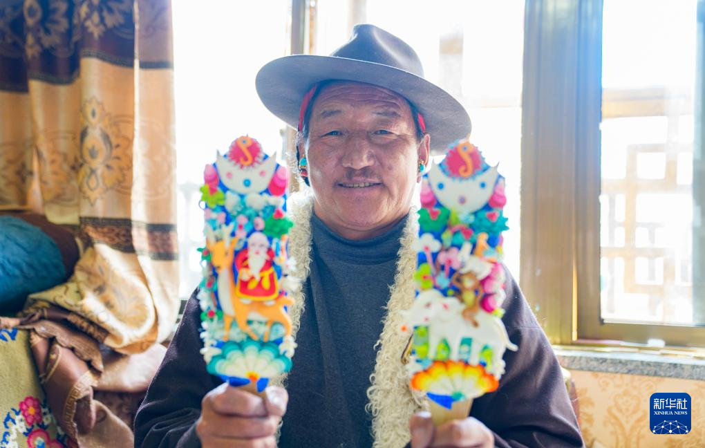 2月12日,在拉薩市林廓東路,來(lái)自西藏日喀則市仁布縣普松鄉(xiāng)的手工藝人羅布展示做好的酥油花。新華社記者 丁增尼達(dá) 攝