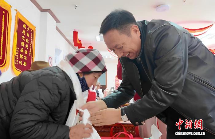 圖為西藏長(zhǎng)壽未老社會(huì)日間照料服務(wù)中心負(fù)責(zé)人為老人獻(xiàn)哈達(dá)、贈(zèng)慰問(wèn)品。貢桑拉姆 攝