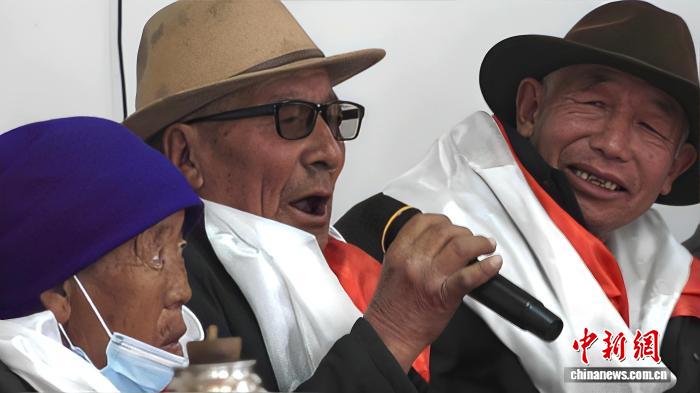 圖為雙節(jié)慶祝活動(dòng)上,照料中心老人拿起話筒唱起了吉祥歌曲。貢桑拉姆 攝