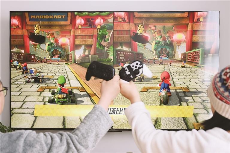 拉薩市民在家中體驗任天堂經(jīng)典游戲《馬里奧賽車》。