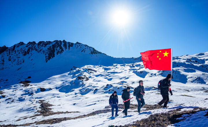50歲的普布羅布單手舉著五星紅旗,走在隊(duì)伍最前面。索朗多吉不時(shí)用望遠(yuǎn)鏡看向更遠(yuǎn)處的雪線?!坝袥](méi)有人越過(guò)邊境,裸露的石頭上有沒(méi)有他國(guó)的標(biāo)識(shí)物……這些都是巡邊要注意的事。”他說(shuō)。