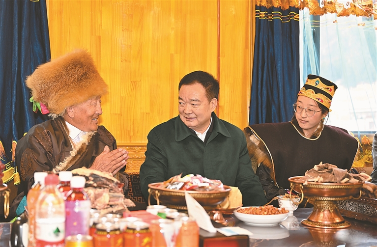 中華民族傳統(tǒng)節(jié)日春節(jié)剛過(guò),雪域高原又迎來(lái)了藏歷新年初二,家家戶戶回蕩著“羅薩扎西德勒”的溫馨祝福。“過(guò)年了,祝你們新年快樂(lè)、身體健康、吉祥如意!”王君正走進(jìn)魯朗鎮(zhèn)扎西崗村77歲的老黨員、致富帶頭人平措家里,嶄新的香布、整潔的小院,切瑪斑斕、卡塞飄香,家里充滿濃濃的年味兒?!吧眢w怎么樣?”“民宿生意好不好?”在暖意融融的客廳里,王君正和老人聊家常,詢問(wèn)身體狀況及家庭收入等情況,隨后走進(jìn)平措家的民宿旅館,從價(jià)格、住宿條件到屋外山景,看得仔細(xì)、問(wèn)得深入。了解到在以習(xí)近平同志為核心的黨中央親切關(guān)懷下,扎西崗村發(fā)生了翻天覆地的變化,平措一家借助本地旅游資源,開(kāi)民宿、做餐飲,年收入不斷增加,日子越過(guò)越好,王君正為他們的發(fā)展感到由衷高興、為他們的幸福生活點(diǎn)贊。他說(shuō),“看著北斗星走不迷路、跟著共產(chǎn)黨走會(huì)幸福”,這些好日子,離不開(kāi)以習(xí)近平同志為核心的黨中央對(duì)西藏工作的高度重視、對(duì)西藏各族人民的深切關(guān)懷,大家要感恩總書(shū)記、感謝黨中央,更加堅(jiān)定不移聽(tīng)黨話、感黨恩、跟黨走;黨員要發(fā)揮先鋒模范作用,發(fā)揚(yáng)黨的光榮傳統(tǒng)和優(yōu)良作風(fēng),帶領(lǐng)村民用勤勞的雙手把家園建設(shè)得更加美好,把日子過(guò)得更加甜蜜。