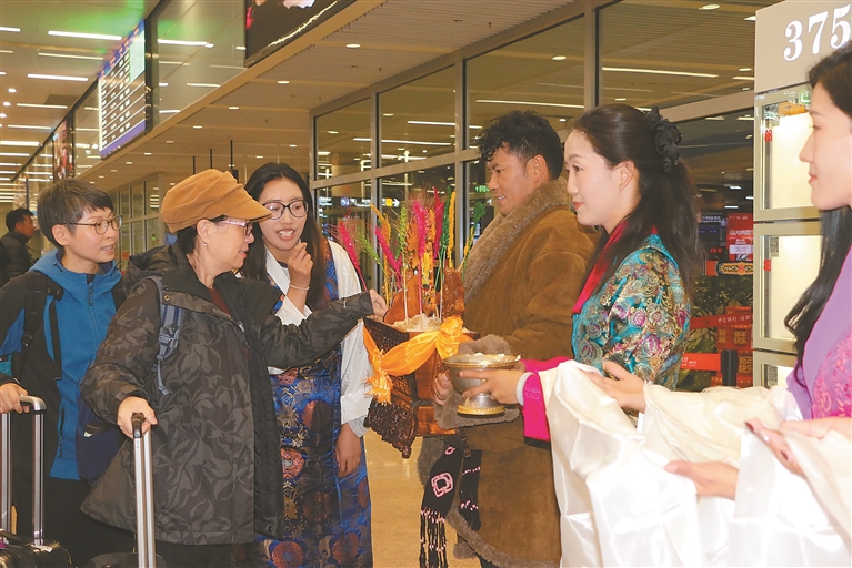 當(dāng)首批香港游客走出機場時,悠揚的歌聲響起,藝術(shù)團成員迎上前,向每一位遠道而來的客人敬獻哈達。