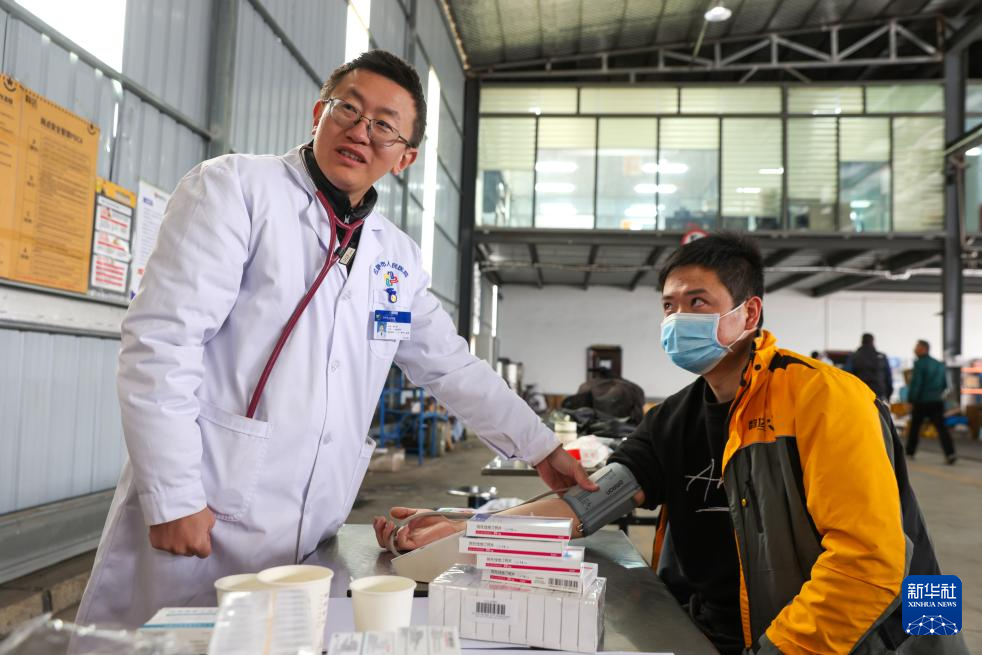 3月13日,來(lái)自首都醫(yī)科大學(xué)附屬北京安貞醫(yī)院的心內(nèi)科專家傅彪(左)為快遞從業(yè)人員義診。新華社記者 姜帆 攝