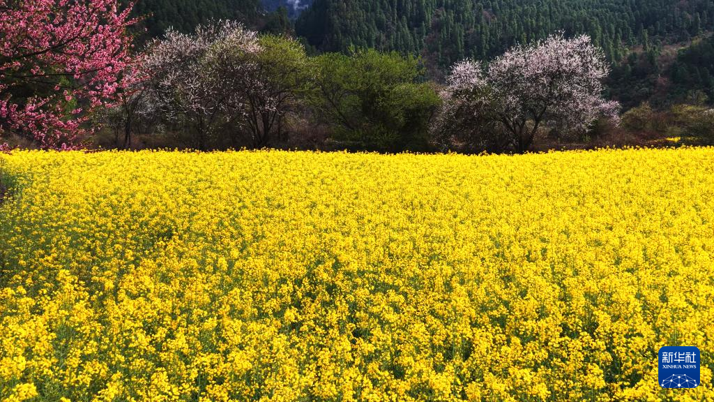 3月20日在西藏林芝市波密縣易貢鄉(xiāng)拍攝的油菜花與桃花(無人機照片)。新華社記者 普布次仁 攝