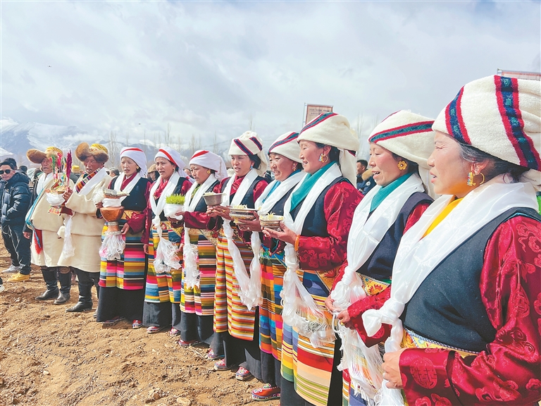 春耕春播儀式上,村民手持糌粑,祈愿五谷豐登、青稞豐收。(圖片由林周融媒提供)
