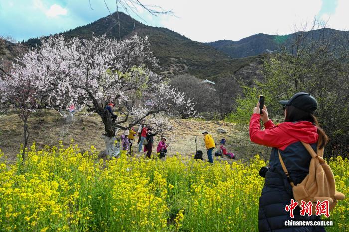 4月3日,游客在嘎拉村拍照留念。西藏林芝市嘎拉村被譽為“林芝桃花第一村”,是林芝市最佳的賞花地之一。中新社記者 貢嘎來松 攝