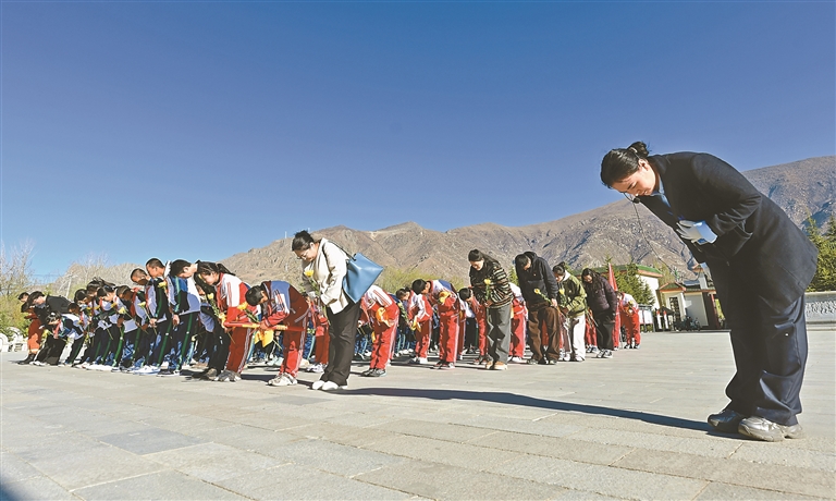 拉薩市中小學(xué)生代表在拉薩烈士陵園革命烈士紀(jì)念碑前鞠躬致敬。記者 唐斌 白瑪澤旺 攝