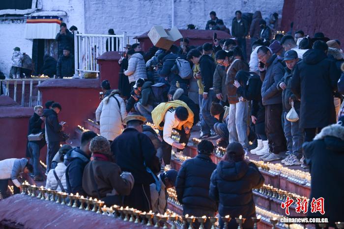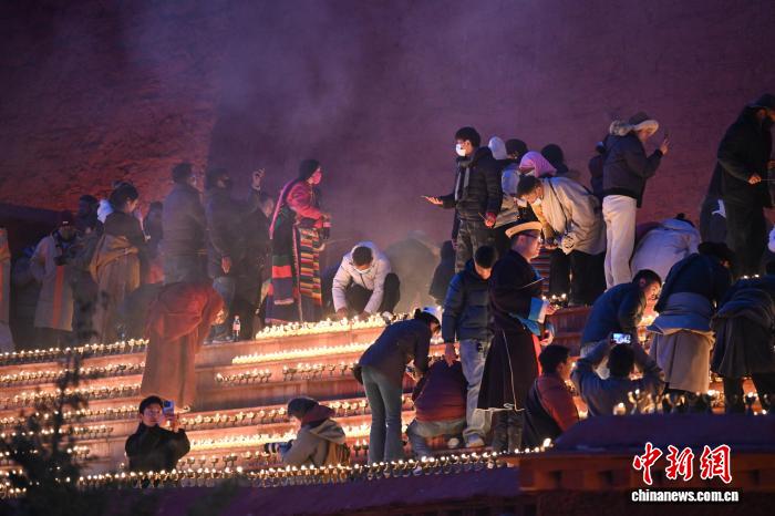 12月14日即藏歷十月二十五日,是藏傳佛教格魯派燃燈日。在西藏拉薩市的藏傳佛教格魯派祖寺甘丹寺內(nèi),信眾點(diǎn)燃酥油燈,祈福平安吉祥?!叭紵羧铡笔羌o(jì)念藏傳佛教格魯派創(chuàng)始人宗喀巴大師圓寂而舉行的活動,已有600多年歷史。圖為信眾在甘丹寺內(nèi)點(diǎn)酥油燈。 中新社記者 貢嘎來松 攝
