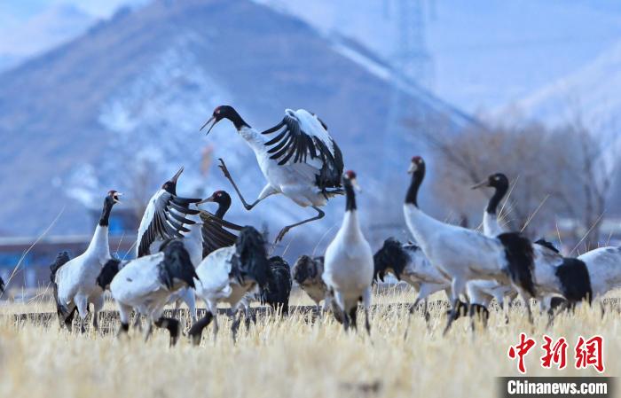 圖為拉薩林周縣黑頸鶴保護(hù)區(qū)內(nèi),黑頸鶴正在覓食、嬉戲。貢嘎來松 攝