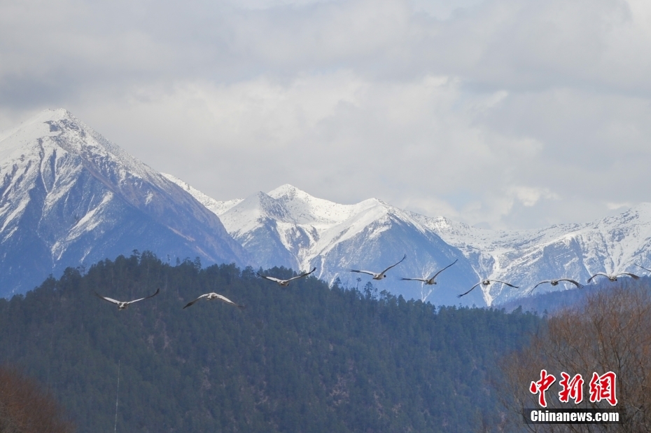 3月30日,在西藏林芝市巴宜區(qū)更章門巴民族鄉(xiāng),黑頸鶴與周邊的村莊、桃花、雪山融為一體,成為春日里的一道靚麗的風(fēng)景線。圖為黑頸鶴在田間覓食嬉戲。 [詳細(xì)] -