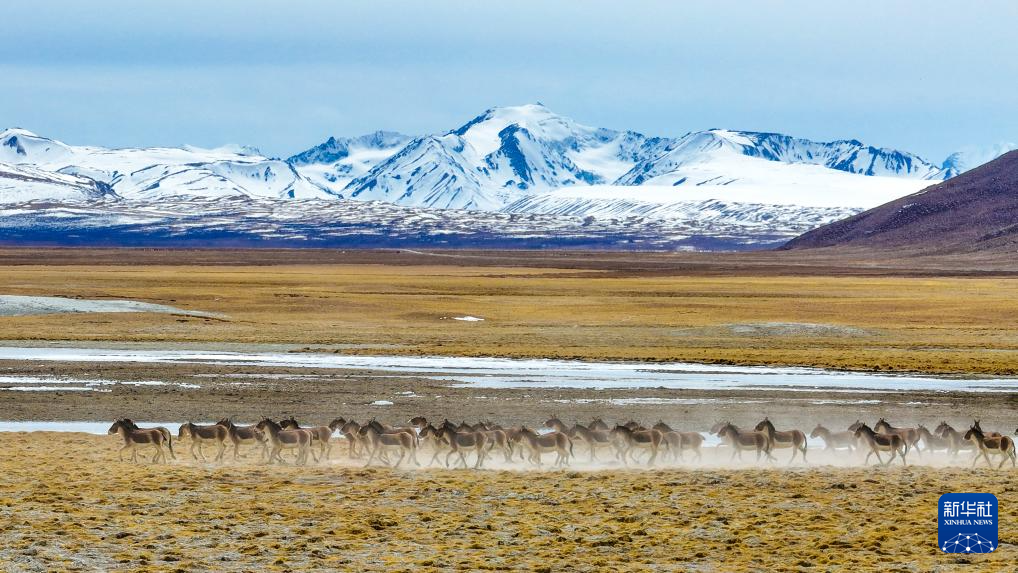 3月29日,藏野驢在西藏阿里地區(qū)普蘭縣境內雪山下奔跑(無人機照片)。新華社發(fā)(劉曉東攝)