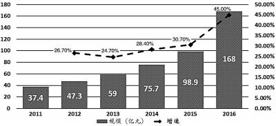 表:2011—2016我國大數(shù)據(jù)交易市場規(guī)模及增速 數(shù)據(jù)來源:易觀國際數(shù)據(jù)