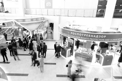 9月11日,俄羅斯符拉迪沃斯托克,人們?cè)趨⒂^東方經(jīng)濟(jì)論壇上的展位。新華社發(fā)