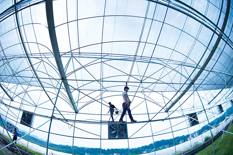 近年來(lái),湖北省恩施土家族苗族自治州宣恩縣大力發(fā)展“設(shè)施農(nóng)業(yè)”,通過(guò)企業(yè)、合作社、家庭農(nóng)場(chǎng)等將農(nóng)民手中的土地進(jìn)行流轉(zhuǎn),發(fā)展農(nóng)業(yè)觀光園和生態(tài)采摘園,為當(dāng)?shù)剞r(nóng)民開(kāi)辟一條產(chǎn)業(yè)脫貧的新路。圖為宣恩縣李家河鎮(zhèn)二虎寨村,工人們?cè)诖罱乜卮笈铩?新華社記者 宋文/攝