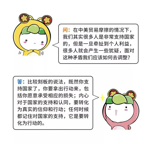 面對短期的困難和波動(dòng),青年人要清楚“美國在貿(mào)易戰(zhàn)中提出的要價(jià),不是小打小鬧”,應(yīng)該堅(jiān)定立場,“抗?fàn)幍降住?,也要“風(fēng)物長宜放眼量”,避免局限于眼前的小確幸,被暫時(shí)的挫折和困難所擊倒,要有與國家民族的發(fā)展同方向的扎實(shí)的行動(dòng),在實(shí)踐中實(shí)現(xiàn)自我價(jià)值。