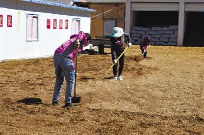 位于林芝市米林縣米林鎮(zhèn)雪卡村的米林鎮(zhèn)紅太陽科技示范家庭農(nóng)場,創(chuàng)建于2012年9月,38個(gè)溫室大棚里,有15個(gè)大棚用于種植靈芝。在尼瑪和米林縣米林鎮(zhèn)扶貧信息員程攀的帶領(lǐng)下,記者首先看到的是3個(gè)女工正在翻曬木屑,這是靈芝菌菌袋中最關(guān)鍵的“載體”——青崗木木屑?!扒鄬灸拘纪ㄟ^高溫蒸煮、殺毒殺菌等程序后再種下野外收集來的孢子粉,移到右邊的房間里培育?!背膛收f。