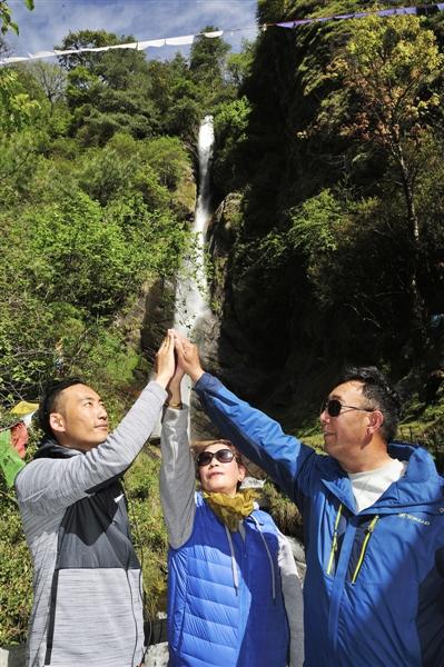 來自成都的格桑拉春和丹巴熱杰相互攙扶著往山上走。這次勒布溝之行,是女兒看到了西藏商報上的消息,特地給他們報的名,女兒說,就當母親節(jié)送給母親的禮物。