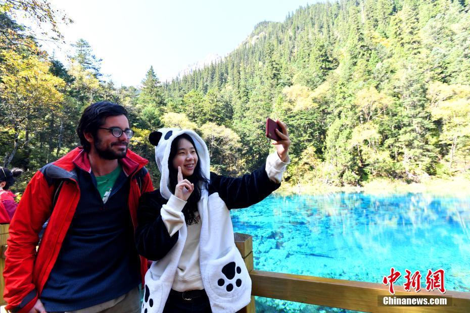 9月27日,四川九寨溝景區(qū)試開園迎來首批游客。九寨溝風(fēng)景區(qū)經(jīng)過兩年災(zāi)后恢復(fù)重建,從即日起開始恢復(fù)接待團(tuán)隊(duì)游客,每日限流5000人。圖為游客在長(zhǎng)海景點(diǎn)自拍留念。中新社記者 安源 攝