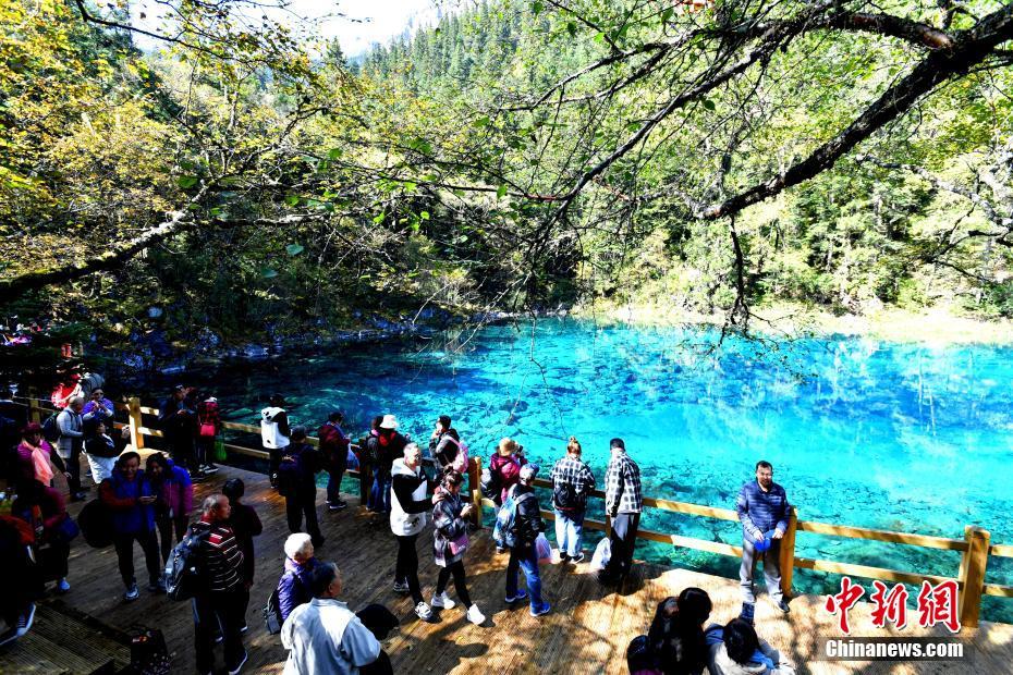9月27日,四川九寨溝景區(qū)試開園迎來首批游客。九寨溝風(fēng)景區(qū)經(jīng)過兩年災(zāi)后恢復(fù)重建,從即日起開始恢復(fù)接待團(tuán)隊(duì)游客,每日限流5000人。圖為游客在五彩池景點(diǎn)參觀。中新社記者 安源 攝
