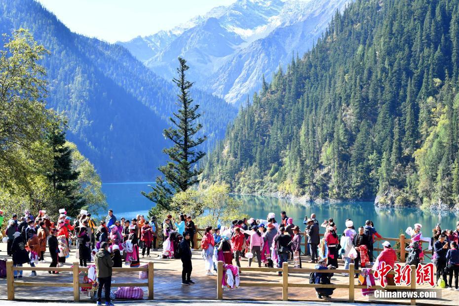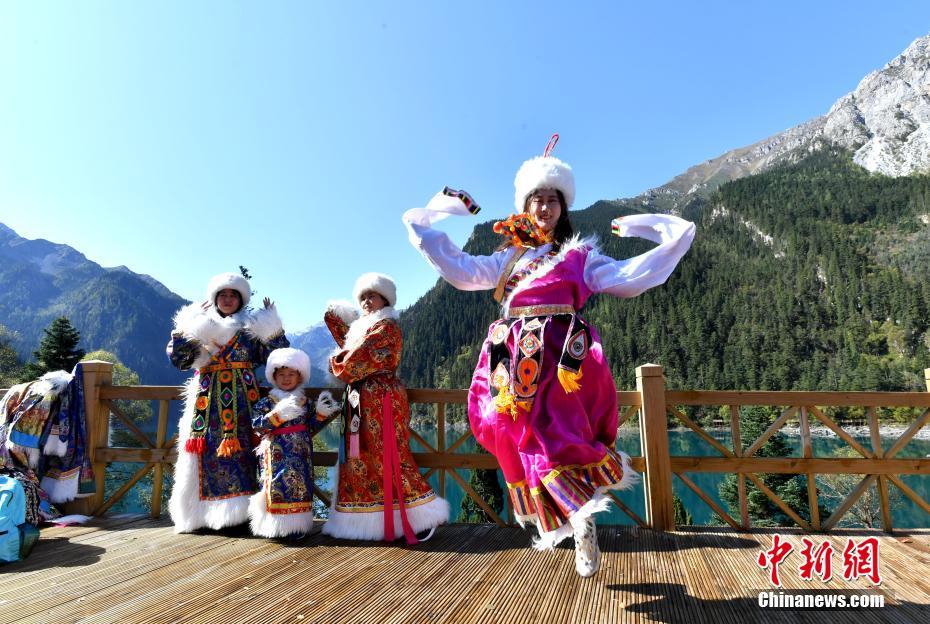 9月27日,四川九寨溝景區(qū)試開園迎來首批游客。九寨溝風(fēng)景區(qū)經(jīng)過兩年災(zāi)后恢復(fù)重建,從即日起開始恢復(fù)接待團(tuán)隊(duì)游客,每日限流5000人。圖為游客身著民族服裝在長(zhǎng)海景點(diǎn)拍照留念。中新社記者 安源 攝