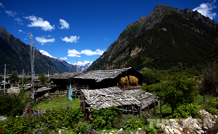 巍峨聳立的杰青那拉嘎布雪山山峰,云絮駐足。雪線下密林廣布,延伸到山腳便是整齊規(guī)劃、統(tǒng)一建造的錯高村村民新居。沿著村里的一條土路,來到村口的濕地處,尋覓一處高地,再回望錯高村,便是一次“穿越”之旅。