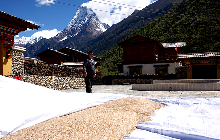 圖為錯高村村民帕加在門前晾曬青稞 攝影:王媛媛