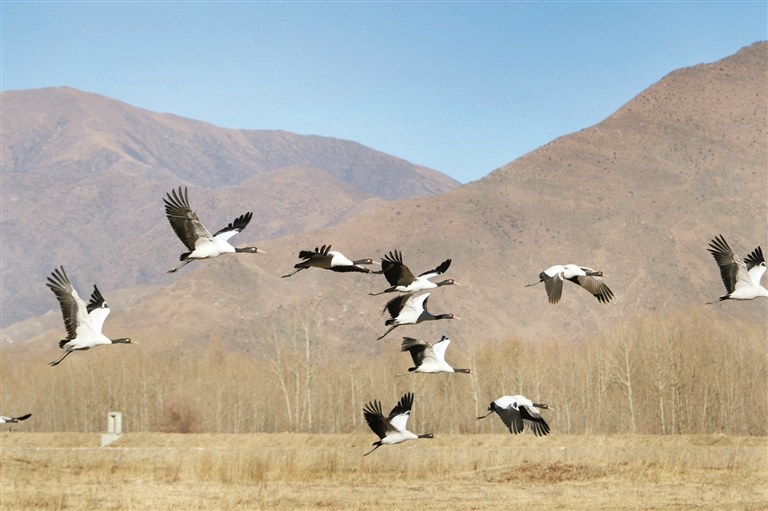 隨著氣溫逐漸下降,大批遷徙候鳥來到西藏拉薩市。在拉薩河谷、拉魯濕地、宗角祿康公園及田間地頭,成群結(jié)隊的鳥兒在波光粼粼的水面上時而低頭覓食、時而嬉戲、時而悠閑飛舞,冬日的高原呈現(xiàn)出一派生機勃勃的景象。圖為拉薩市達孜區(qū)田野上空飛翔的黑頸鶴。記者 平措旺堆 攝