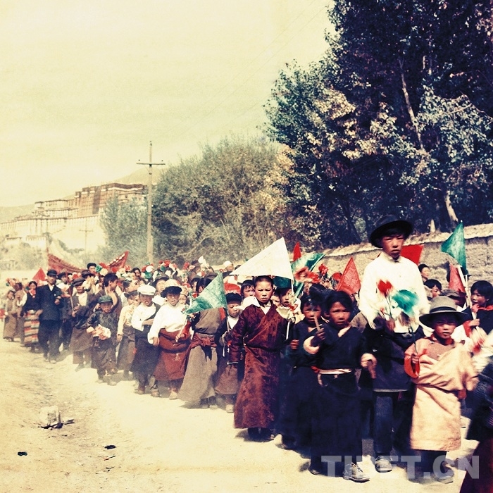 圖為藍(lán)志貴于1959年拍攝的《國(guó)慶十周年藏族兒童在布達(dá)拉宮腳下慶祝游行》 圖片由中國(guó)美術(shù)館提供