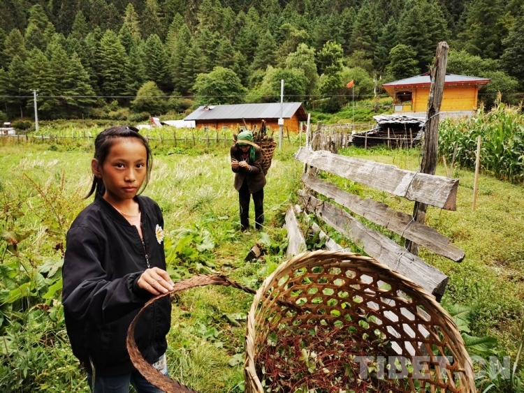 在村路上遇到一老一少兩名女子背著藥簍,我們走上前去,了解到小姑娘11歲叫索郎卓瑪,跟著奶奶上山去采草藥。索郎卓瑪有著棕黑、明亮的眼睛,很漂亮。