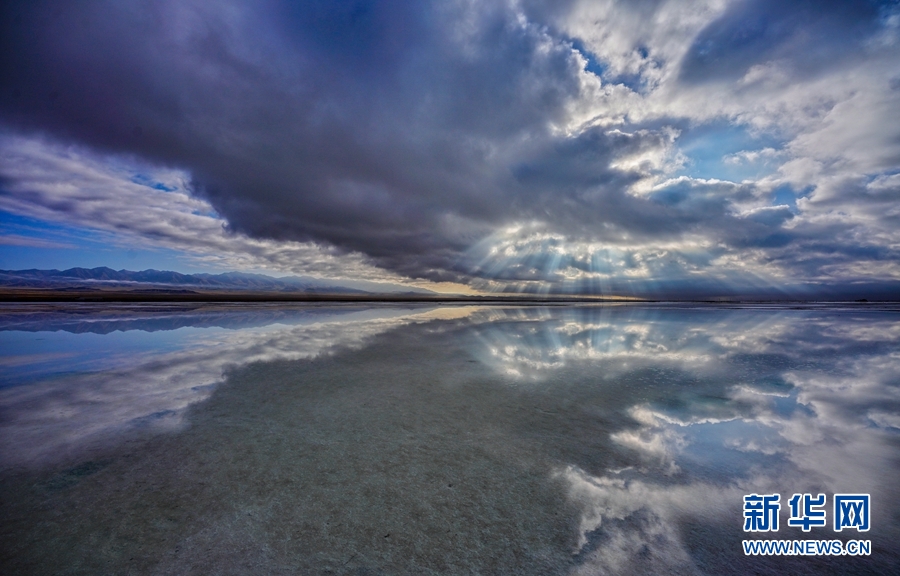 一縷縷金色的陽光透過云層的間隙,照射在干凈的湖泊上,形成茶卡鹽湖獨(dú)特的美。新華網(wǎng)發(fā)(宋忠勇攝)